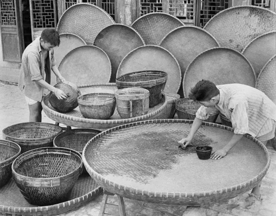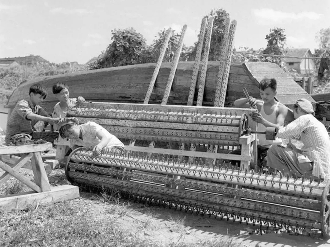 ▲新华社1960年9月5日稿,枫围人民公社农机厂工人们正把双人脚踏脱粒机改为六人操作的动力脱谷机,以减轻劳动强度、提高工作效率。