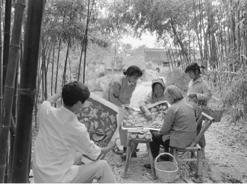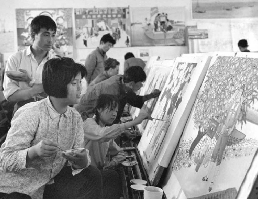 ▲金山县枫围胜利大队曹秀文正在创作一幅歌颂农村“赤脚医生”的农民画。