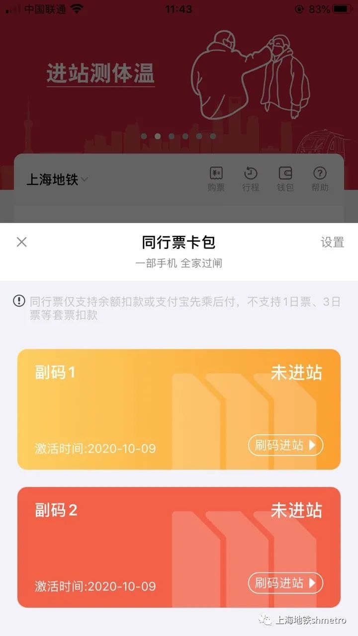 ① 打开大都会APP乘车页,乘车码切换到上海地铁同行票,点击乘车码下方的副码,打开同行票卡包页面,选择“设置”。