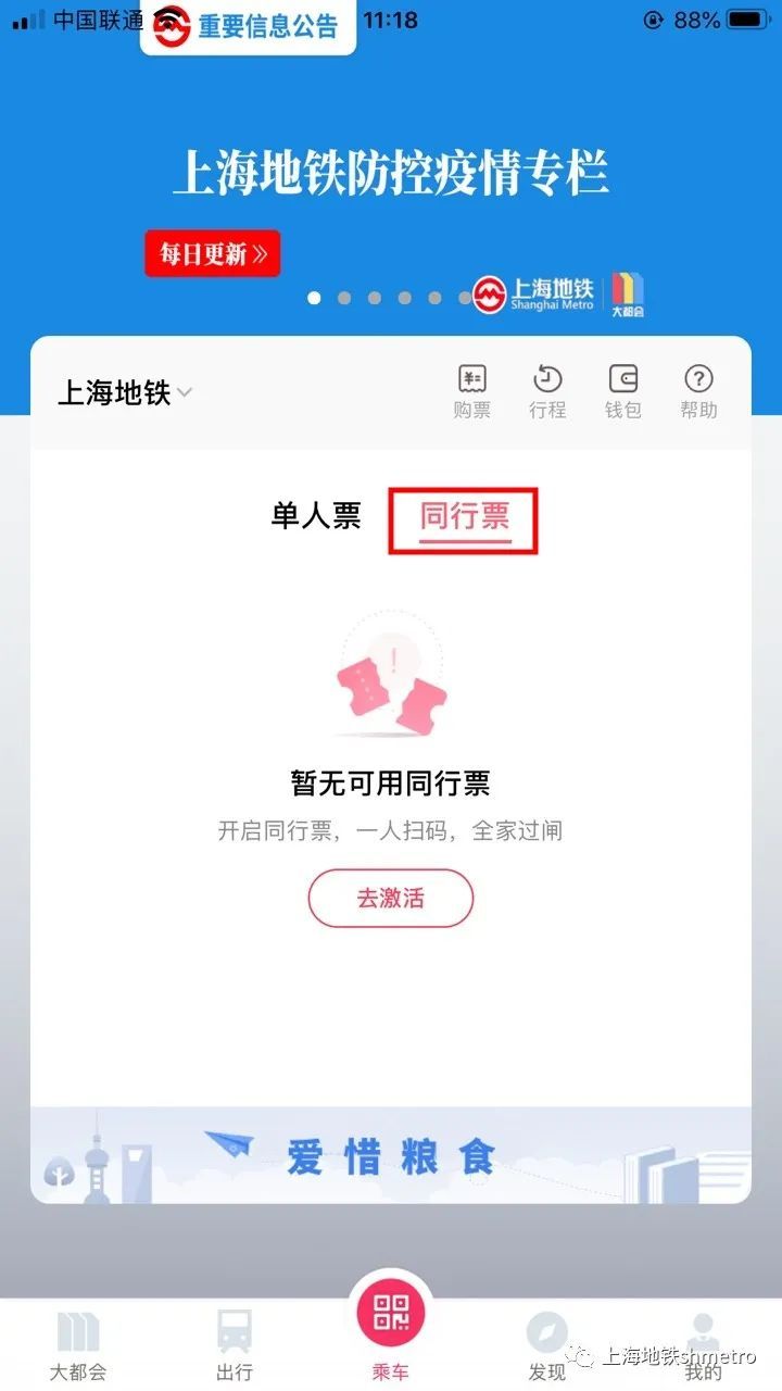1、 进入乘车页,将二维码切换由“单人票”切换为“同行票” 。