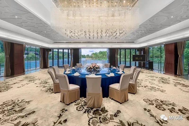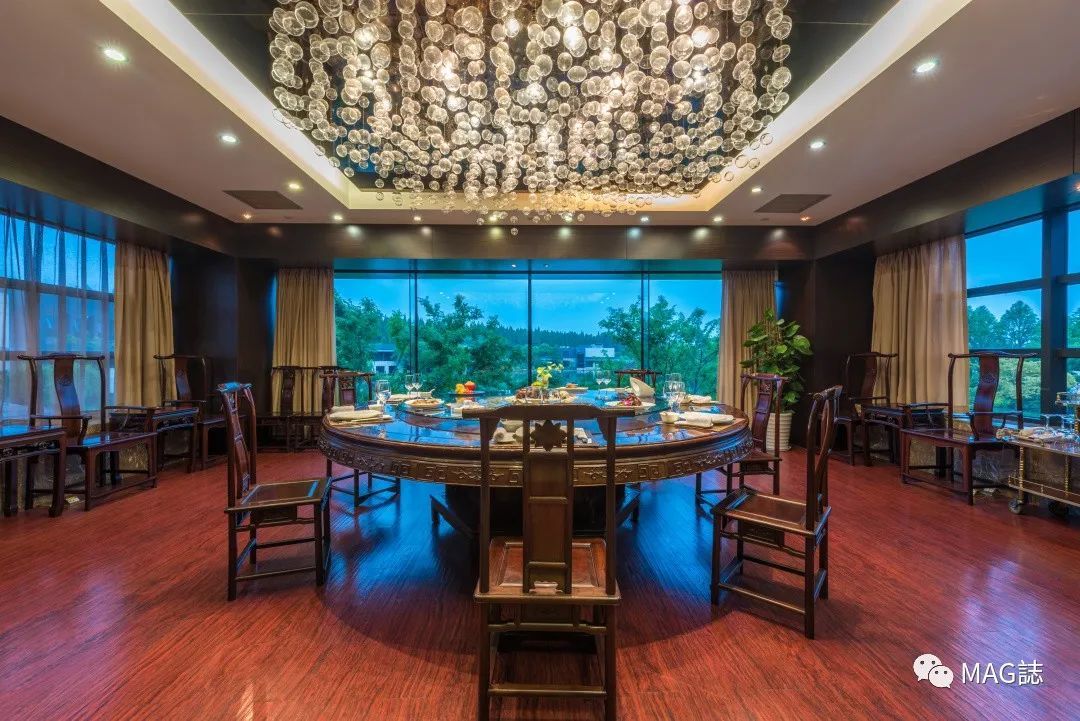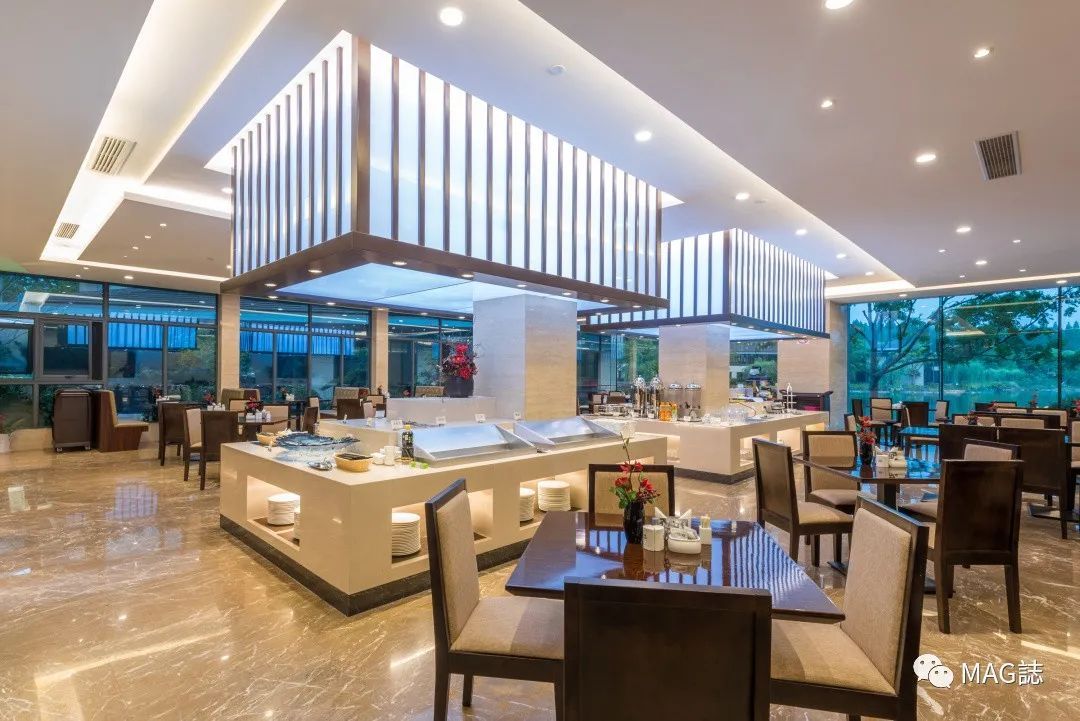餐饮中心内设自助餐区提供中西式自助早餐,另有5间独立包厢。其中瀛洲厅面积约200平方米,并可放置18人大圆桌,坐拥酒店湖区旖旎风光,是高规格宴请的不二之选。