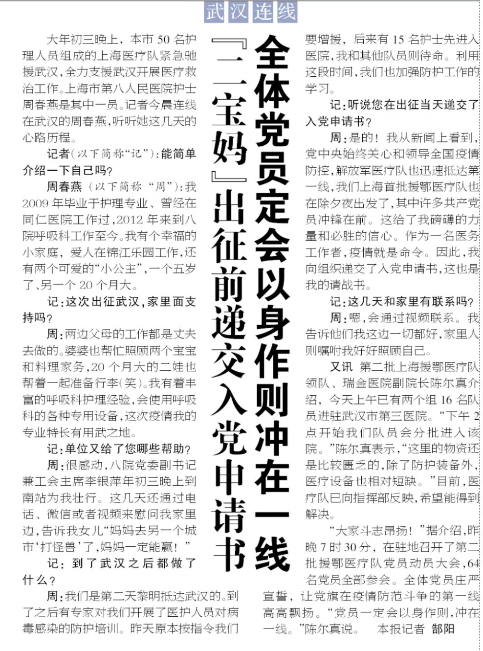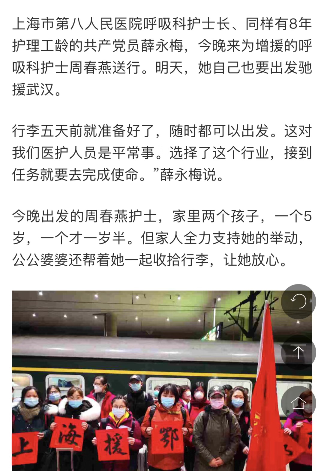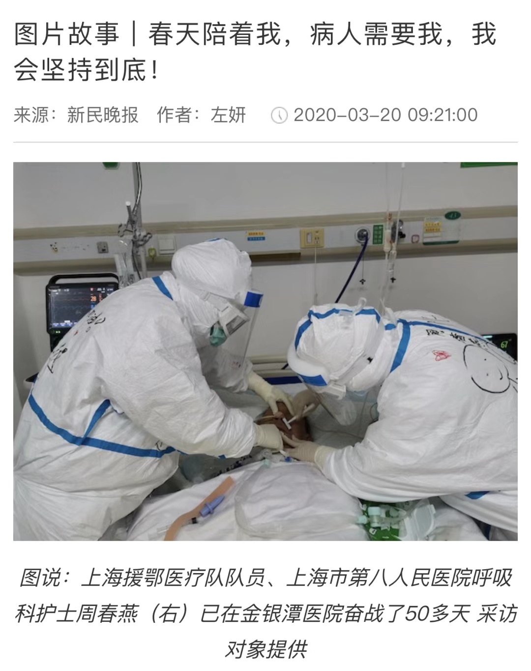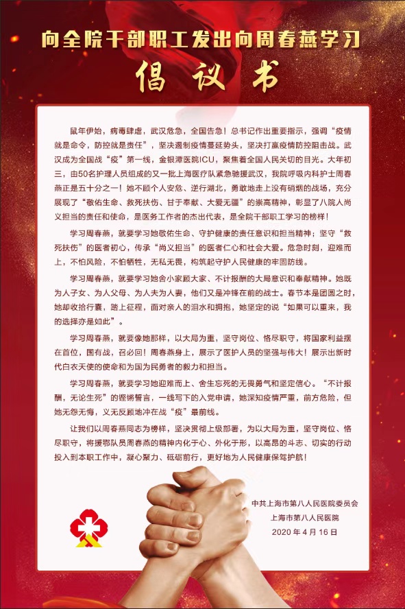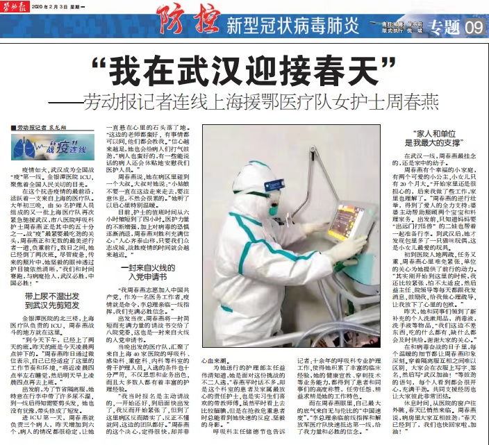 此次新冠疫情袭来,作为一种凶险的呼吸道传播疾病,不少人都谈“新冠”色变。在关键时刻,作为一线人员的周春燕,没有半点的犹豫和退缩,毅然放下了家中两个年幼的孩子,主动报名参加援鄂医疗队,义无反顾入驻武汉金银潭医院北三重症病区,站在了“援鄂”一线。为了工作,她还毅然剪掉自己心爱的头发,工作时常常连续5小时以上,不能上厕所,她就不喝水、穿尿不湿。