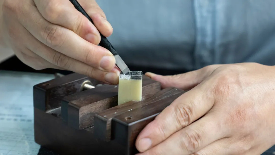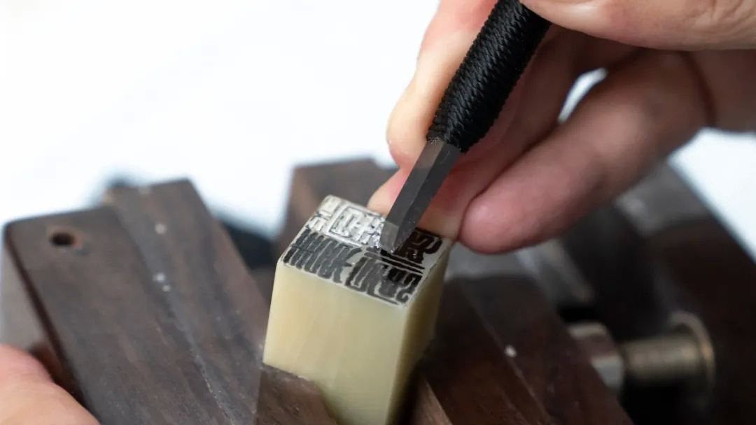 屋外下着毛毛细雨,安静得几乎听不见声音。很快,窗户上蒙上了一层雾似的。桌上的一只手按着印章,另一只手的无名指顶住印石,三指持刀,用刀沿着笔画方向推刀向前。