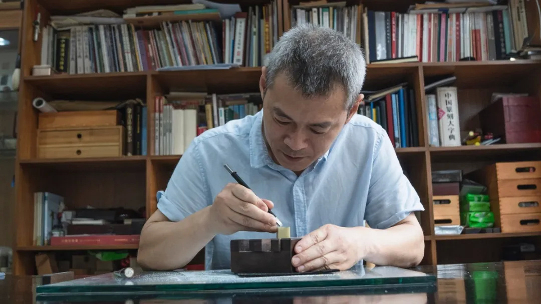 屋外下着毛毛细雨,安静得几乎听不见声音。很快,窗户上蒙上了一层雾似的。桌上的一只手按着印章,另一只手的无名指顶住印石,三指持刀,用刀沿着笔画方向推刀向前。