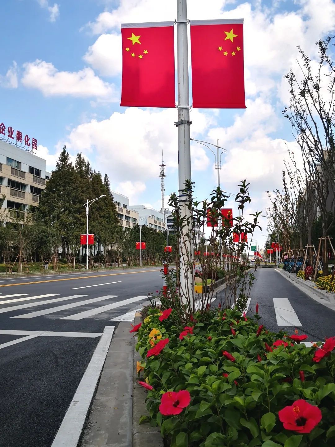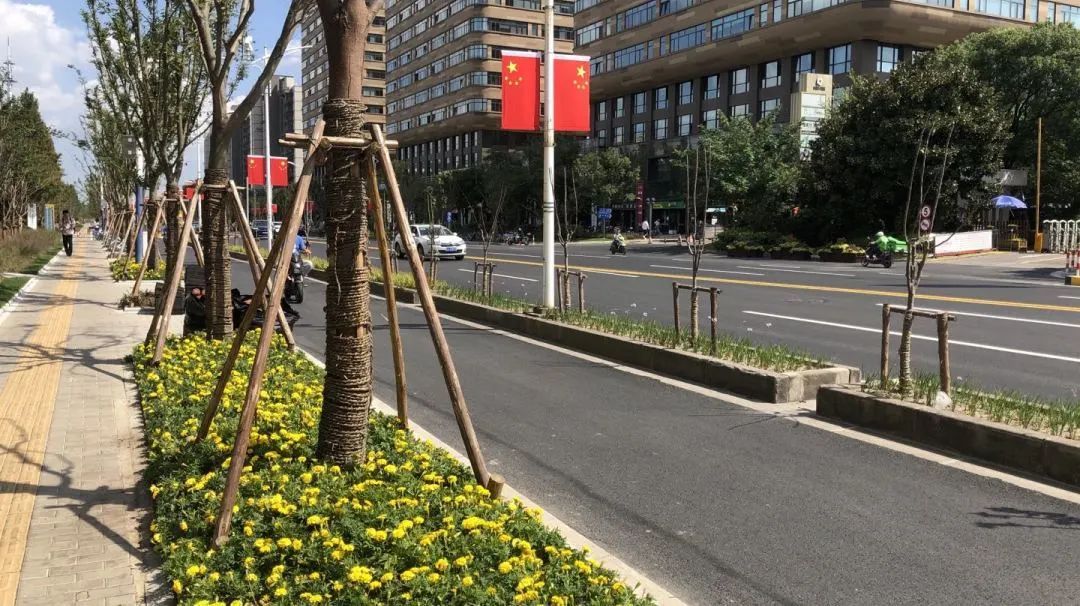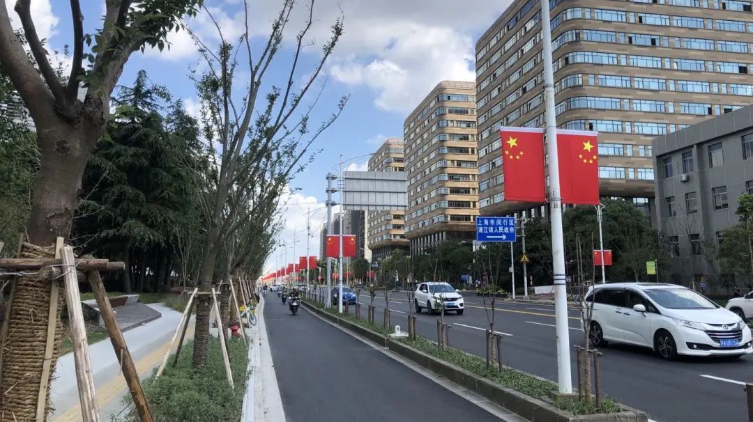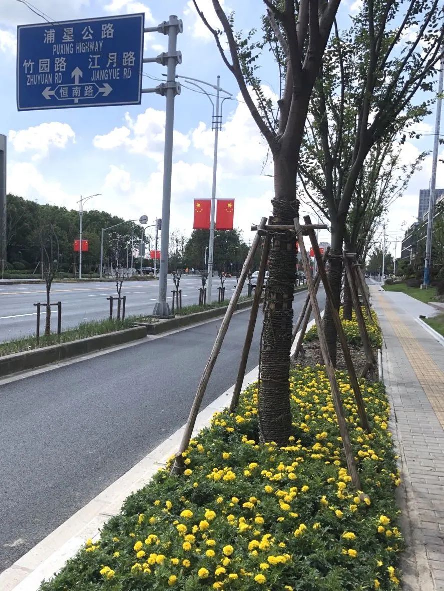 在国庆佳节期间,联航路特色街区也换上新颜,鲜艳的国旗、艳丽的鲜花,处处洋溢着浓烈的节日气氛。联航路特色街区是浦江镇2020年重点打造提升的绿化建设项目,其中涉及到了联航路、恒南路、三鲁公路、万芳路4条道路,全长共4.3公里。