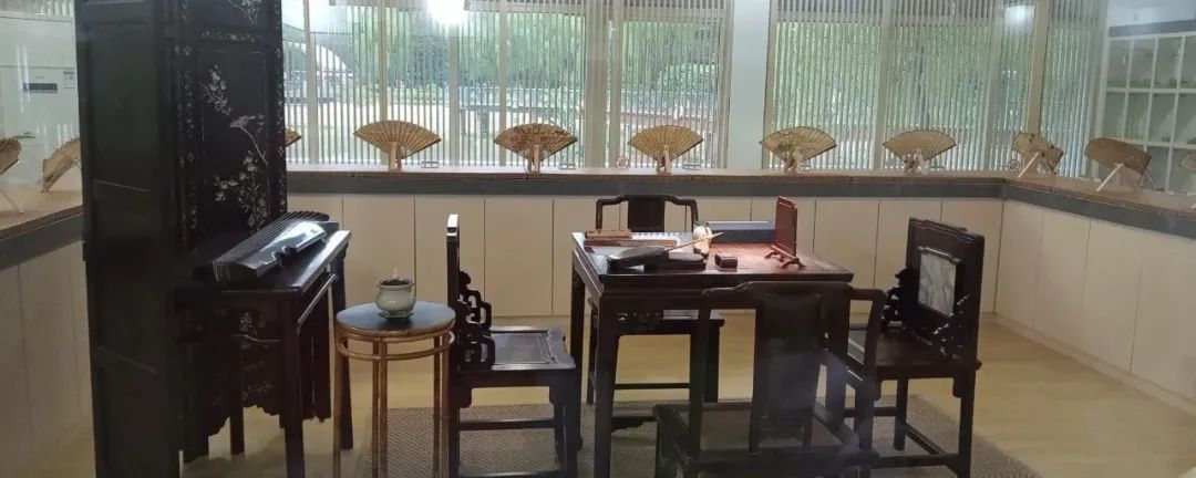 虹桥香事馆展馆面积不大,依湖立亭,临水面桥。竹篱笆墙,庭院深深。曲径通幽,经典雅致。馆内展出了清朝、民国和当代的数十把名贵折扇及扇骨和三把团扇。数量虽不多,但件件是珍品。一眼望去,满目清新。扇面图文并茂,字画吸睛。扇骨形态各异,材质上乘。内景布置的四椅一桌和笔墨纸砚,配以古琴和香炉袅袅,好一派穿越古时江南文人度良宵的诗情画意。