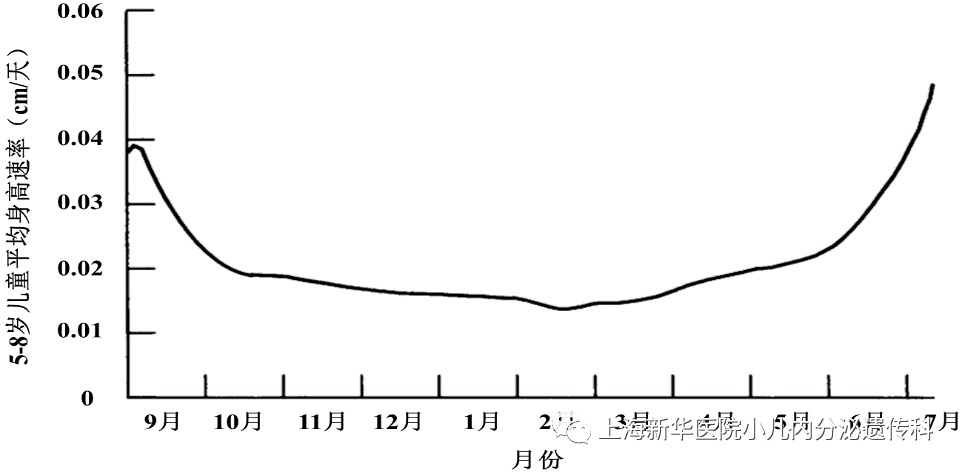 一般而言,孩子的身高增长在一年四季中也并非匀速,春夏季阳光充裕,有益于骨骼的生长发育。一般从3月份生长速率逐渐增加,7-8月份达高峰,9月份逐渐下降,1-2月份最低,春夏季生长速度可达秋冬季节的2-3倍(见图)。