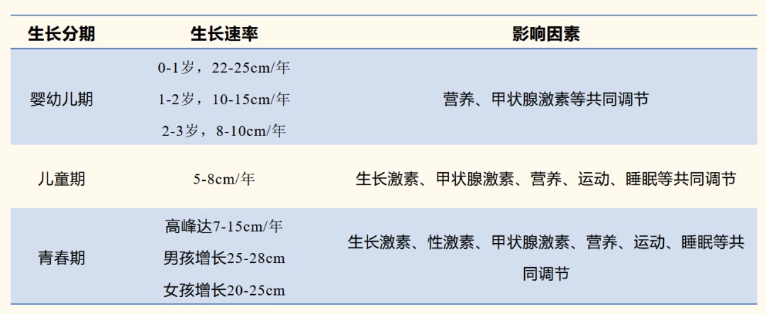 正常的生长是连续的,但不同年龄段生长速率不同,生长高峰出现在婴儿期和青春期。婴幼儿期身高增长占全部生长总长量的40%左右,儿童期占40%-45%,青春期占15%-20%,可见,每个生长时期对长高都很关键。