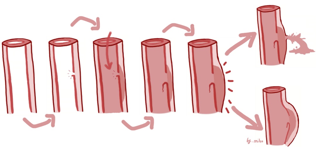 主动脉夹层是由于主动脉内膜撕裂后,腔内血液从内膜破裂口进入主动脉中膜,而形成夹层血肿,并沿着主动脉壁向周围延伸剥离。仿佛是在薄薄的血管壁里硬塞进了一个“血球”,随着心脏的每一次收缩,血液不断被泵入这个“血球”,患者一步步地被自己的心跳推向死亡的深渊;随着“血球”的不断膨胀直至破裂,决堤之势已再不可挡!