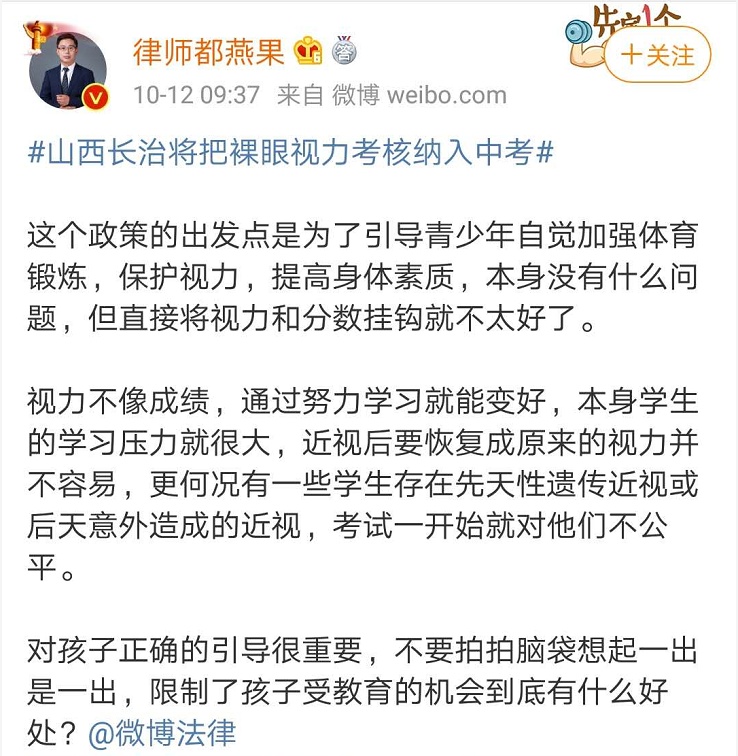 将裸眼视力和体重考核纳入中考,是长治市中考改革的一部分。2019年6月,长治市宣布从2022年开始,当地中考将增设学生综合素质评价50分,其中身体素质占20分。