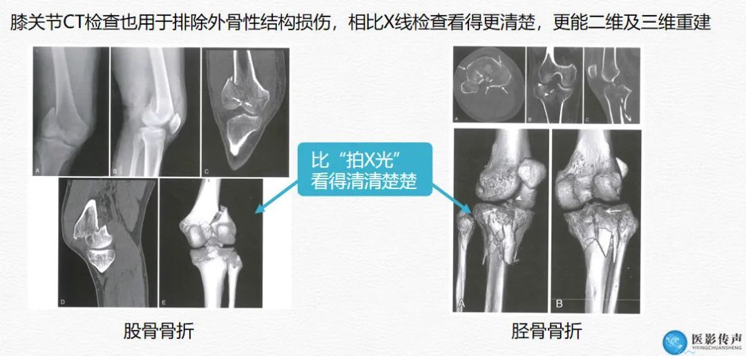 CT比X线观察得更清楚些,除了骨头之外,还可以观察关节周围有无血肿、积液等等。CT还能通过三维重建,360°无死角还原骨头的立体图像,因此深受临床医生的喜爱。