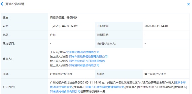据启信宝显示,目前,该案于9月11日在广州知识产权法院公开开庭审理。北京字节跳动科技有限公司对此申请行为保全(案由为商标权权属、侵权纠纷),被告方为河南今日油条餐饮管理有限公司、郑州市金水区今日油条早餐店、河南烧烤者食品有限公司。