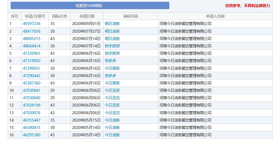 更厉害的是,河南今日油条餐饮管理有限公司成立第二天就申请了“今日油条”的商标,分别申请注册在第43类-餐饮住宿、第30类-方便食品和第35类-广告销售,申请注册了今日豆花、今日面条、今日豆浆、饼多多、快手抓饼、明日油条等商标,部分申请流程处于等待实质审查状态。