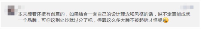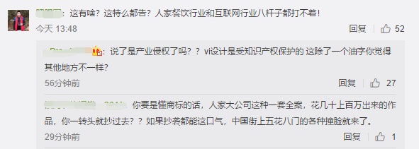 当然也有不同的声音,认为大公司花了几十上百万设计出来的商标,转头就被抄过去,这种行为不被制止,将会有更多山寨。
