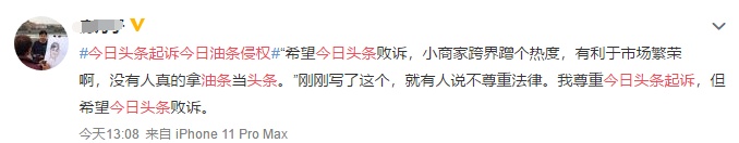 对于被今日头条起诉一事,油条老板回应亮了..."只是觉得“傍大牌”好玩。"