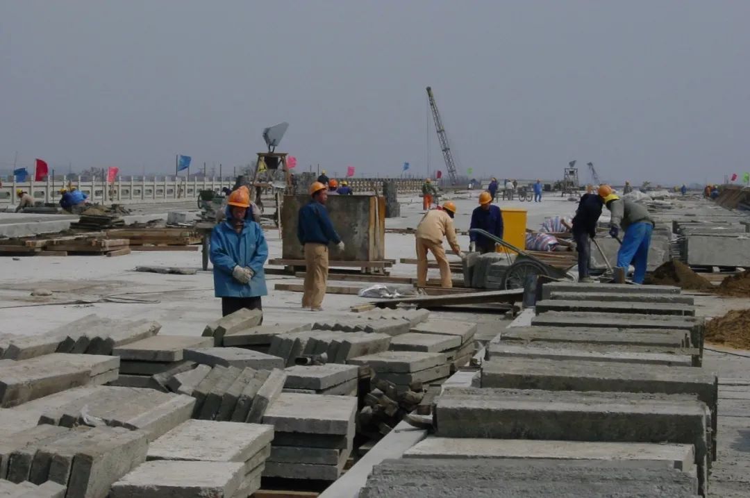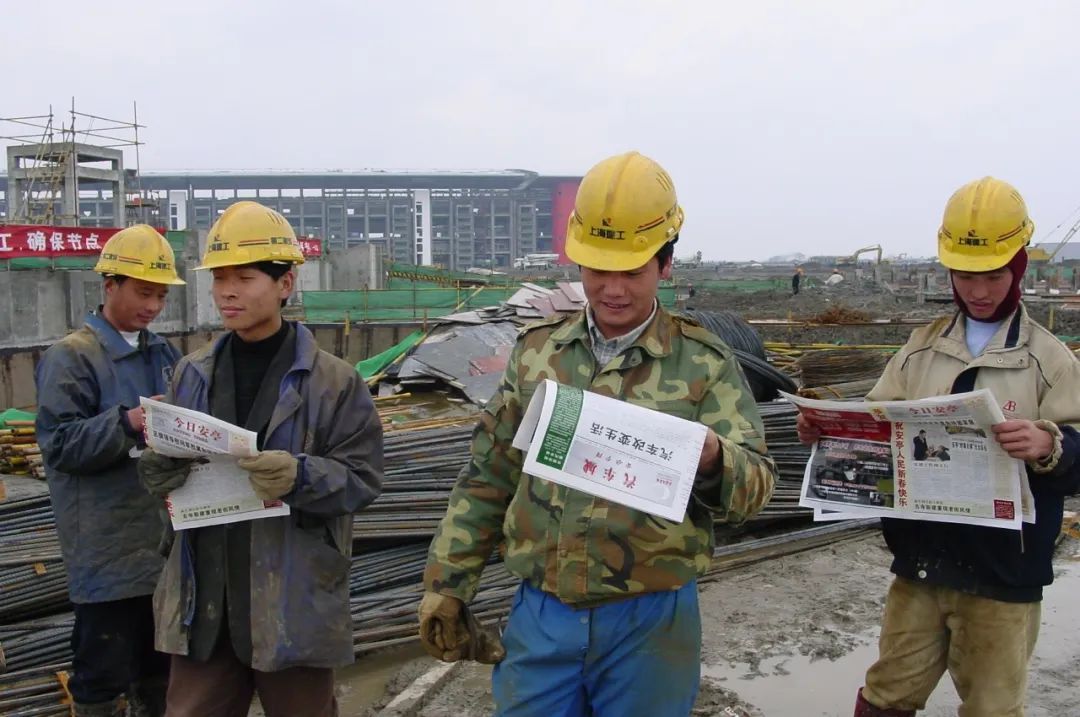 2004年1月,上海国际赛车场建设工地上,建筑工人正在阅读刚出版的《今日安亭》