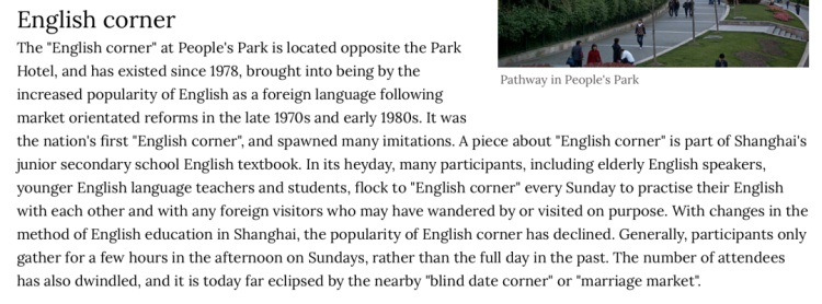 某英文百科关于人民公园英语角的界定是:诞生于1978年,全中国第一个。