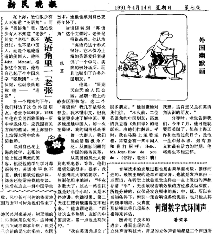 1991年的《新民晚报》报道了一位在上海3年的美国人John Metcalf。他在上海师大附中担任英语老师期间,几乎每周都去英语角。