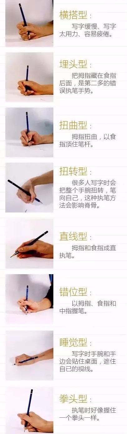 以下这几种常见的错误握笔姿势,家长们快给自家孩子纠正:
