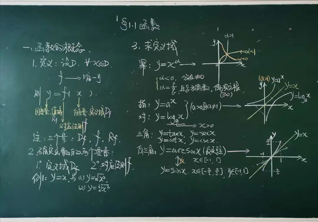 此板书用于复习函数的相关知识。先从函数的概念入手,其次,就函数定义中涉及的三个量,做详细讲解:一方面确定函数只需两个要素;另一方面,就这三个量逐一展开,板书右边一栏就是关于定义域需要考虑的各种情况的说明。