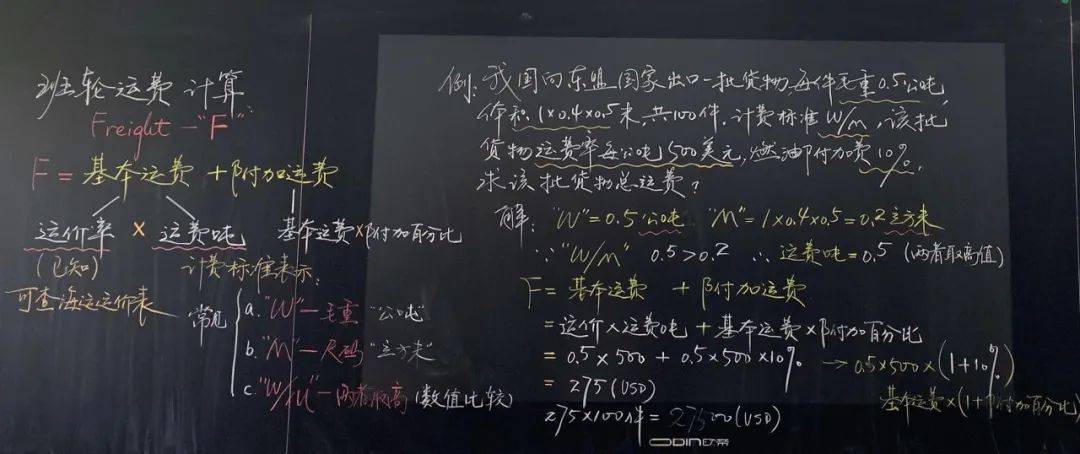 班轮运费计算板书是给学生上国际货物运输项目的海运运费计算内容。先从班轮运费公式导入开始,详细讲解班轮运费计算的步骤和注意事项(尤其是计价标准),然后举例班轮运费计算题,演示计算过程,巩固班轮运费计算公式。此板书右边是其他类型海运运费计算方法的介绍并回忆了国际贸易术语恒等式。