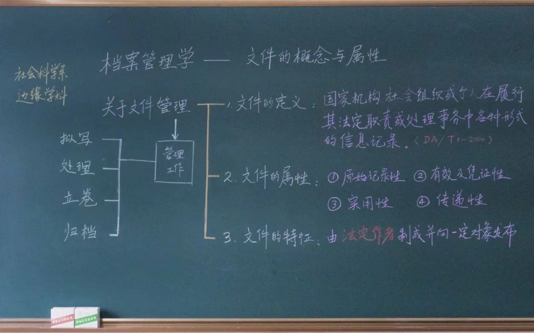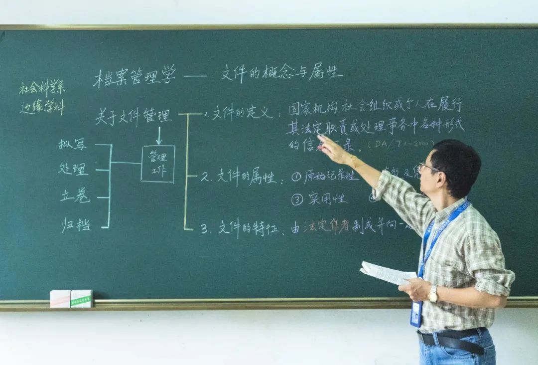 翁吉老师教授的《档案管理学》,板书写得行列交错,笔画纵横,书本里的知识在空间里逐步解构;黑白色彩,条理清晰,复杂的知识点在黑板上一一呈现;定义属性,步骤分类,管理好档案不过是管理好人生的第一步!