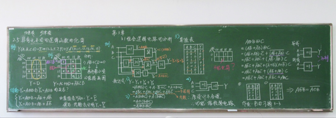 李靖超老师的“数字电路与逻辑设计”的板书,通过典型电路设计的板书,讲解组合逻辑电路的分析,向学生展示绘制电路的过程及计算过程中应注意的问题,更为生动,便于学生记录笔记。