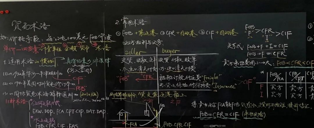 林炜老师教授的《国际贸易实务》课的贸易术语板书是给学生上国际货物合同项目里的商品价格复习内容。先从价格条款的四要素开始,导出其中一要素——国际贸易术语,再复习术语适用的国际惯例和最常用惯例——2010版术语解释通则,接着复习常见六个贸易术语并串讲了它们的组成及彼此间的关系。此板书右边最后是总结了六大术语(3组)的区别和联系。