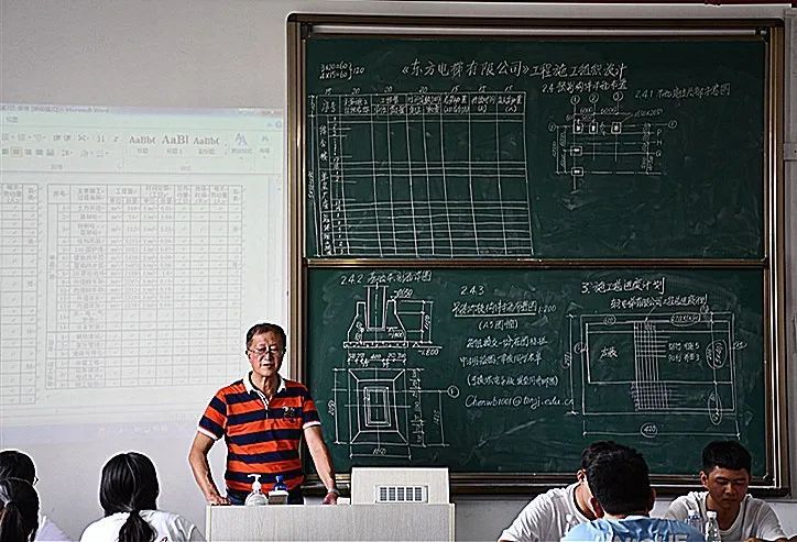 这是建工系兼职教师陈文斌讲授的《建筑施工组织》课的板书。由于专业要求,陈老师的板书更多的是将工程施工组织设计以图表和平面图的形式进行展示,具象地帮助学生更加直观了解工程结构知识点。