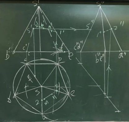 美术学院环境设计专业负责人陈新业老师在《画法几何与阴影透视》授课过程中,坚持使用手绘图讲解每个知识点,如图为五棱锥的棱线与棱面上点的投影作法。通过学习这个知识点,学生可以学会复杂形体的投影求作。