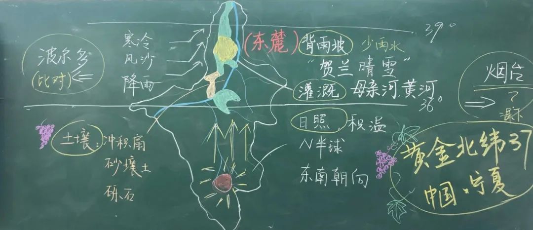 上海旅专陈思老师的《葡萄酒品鉴》课的板书主题为:葡萄酒与风土。好的葡萄酒是种出来的。陈老师沿着葡萄酒神奇的黄金北纬37度,用PPT和板书结合,对比同纬度波尔多,分析几乎同纬度上的中国宁夏贺兰山东麓葡萄产区,了解独特风土条件如何成就好酒。