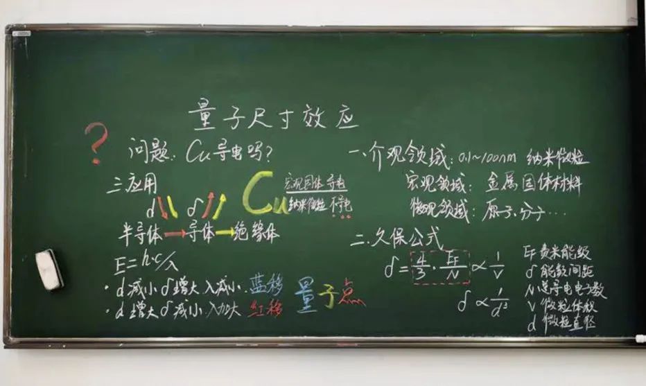 量子尺寸效应是重要的纳米效应,具有一定的理论难度。从“介观领域”出发,引出“久保公式”,再结合“能带理论”,由此运用“量子尺寸效应”解释“块体铜导电,但纳米铜不导电”的现象,最后指出其典型应用材料——量子点。