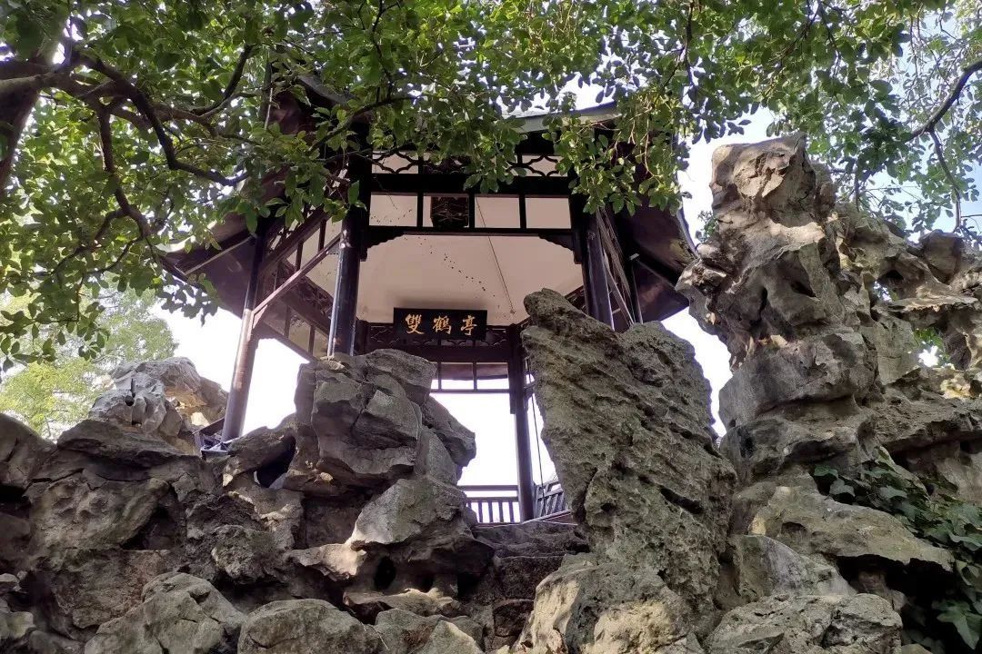 四教厅西南角的西园入口处的大假山上,两座对应的六角亭分别是“双鹤亭”和“乐寿亭”,两座亭上各有一尊仙鹤,象征着延年益寿。有别去于其它凉亭的亭顶,这两座亭均为铜顶。