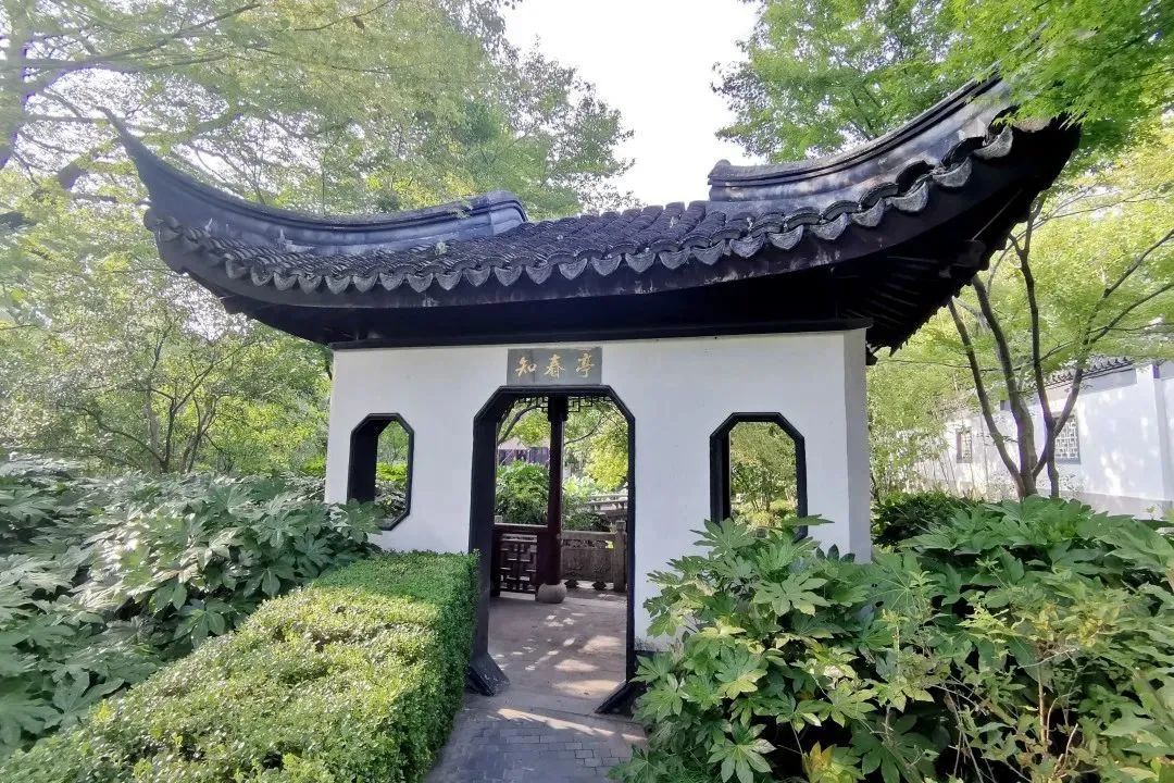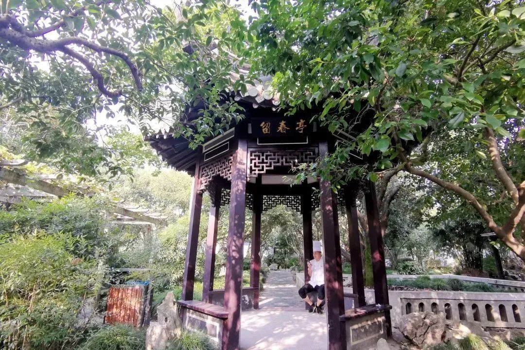 “留春亭”位于正园的般若舫北侧,是一座廊架中的单檐八角亭。