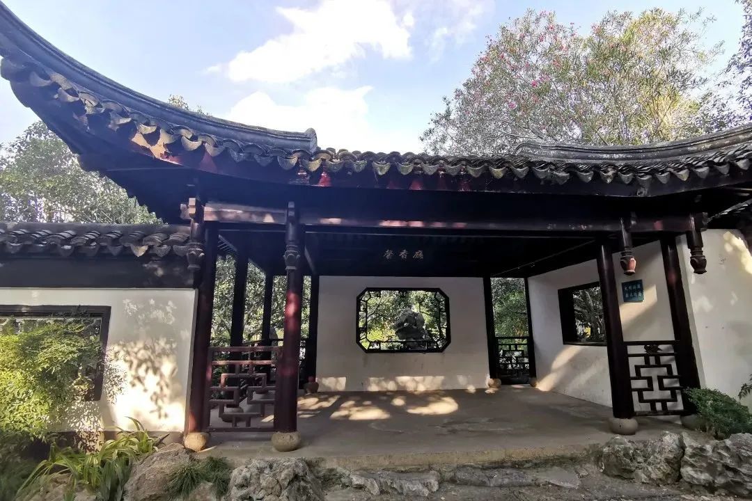 “馨香厅”位于东园和正园的交界处,是一处悠然自得的小天地,从此处往正园方向徒步,即来到了观音阁。