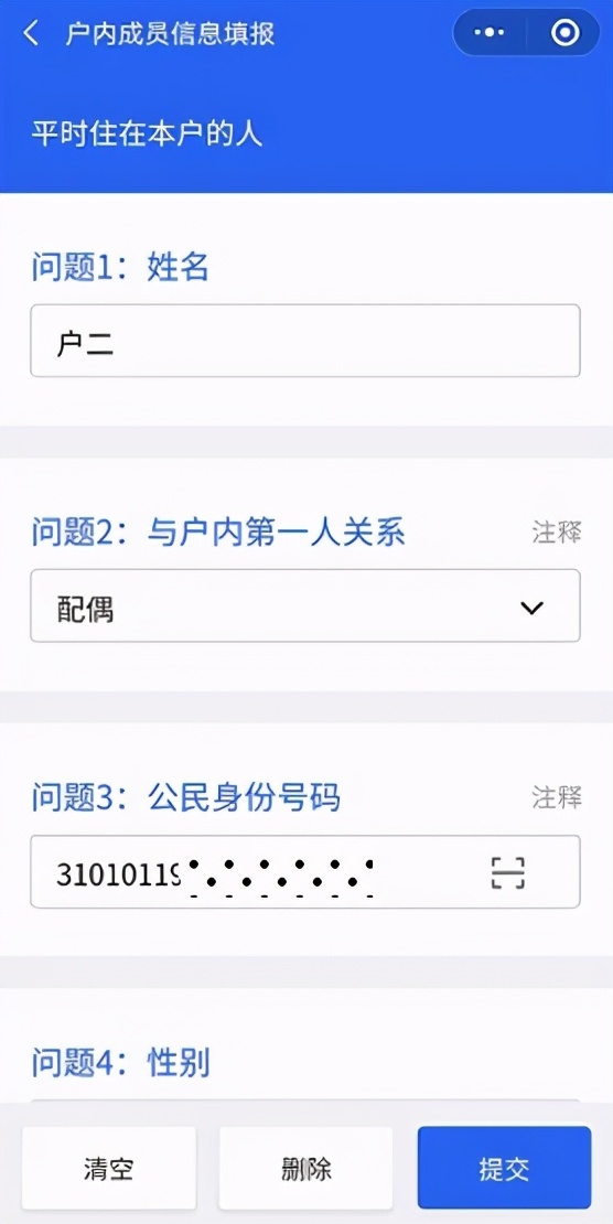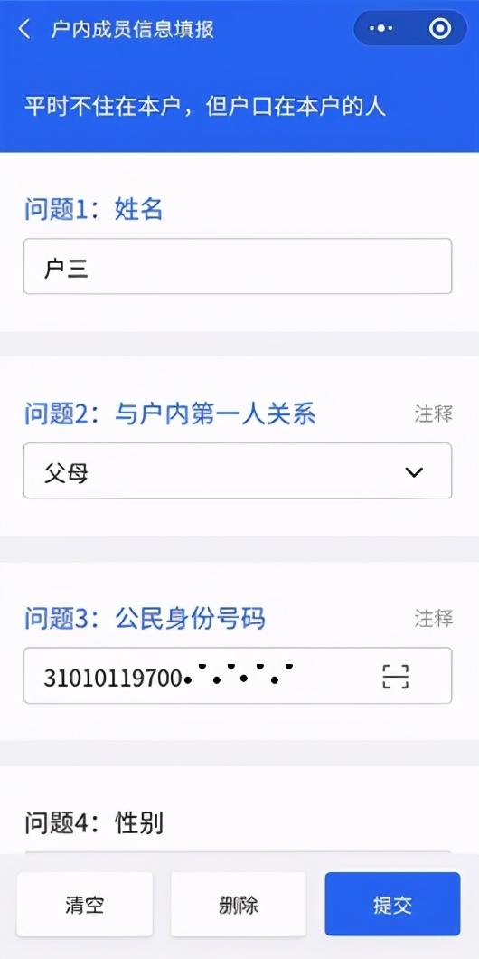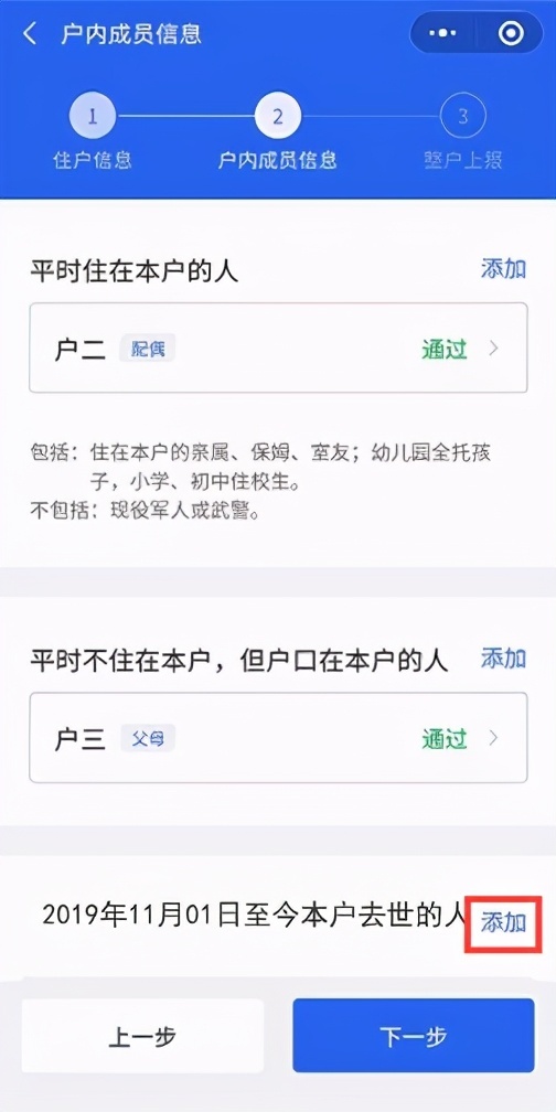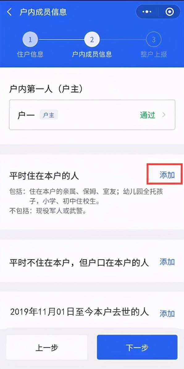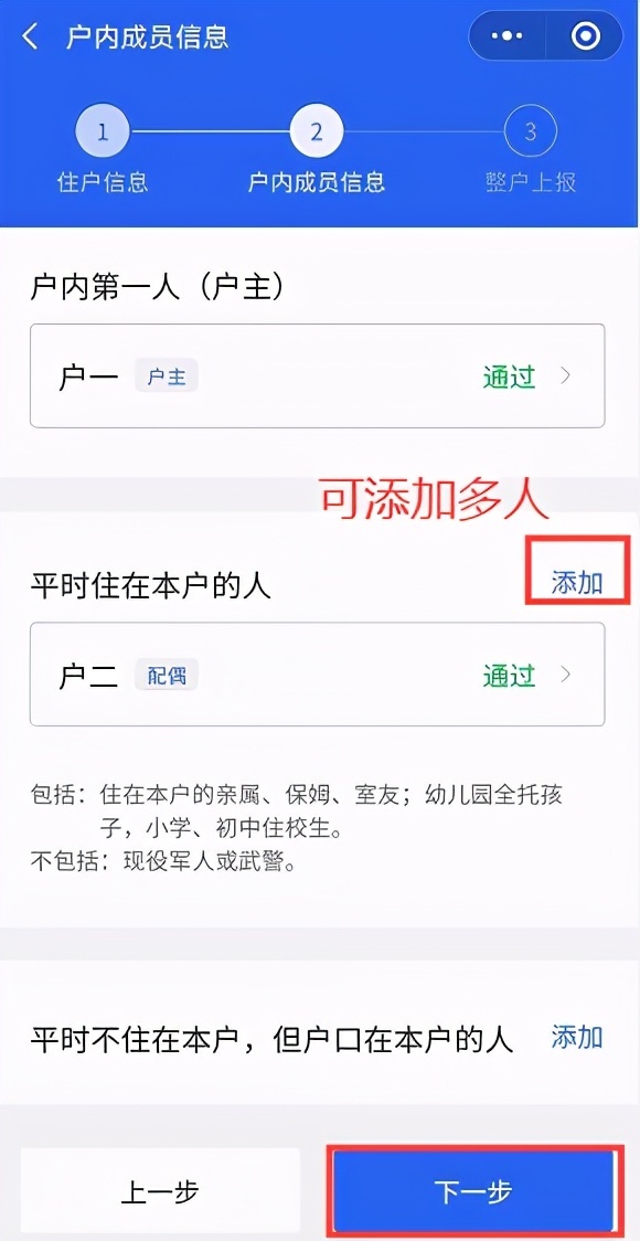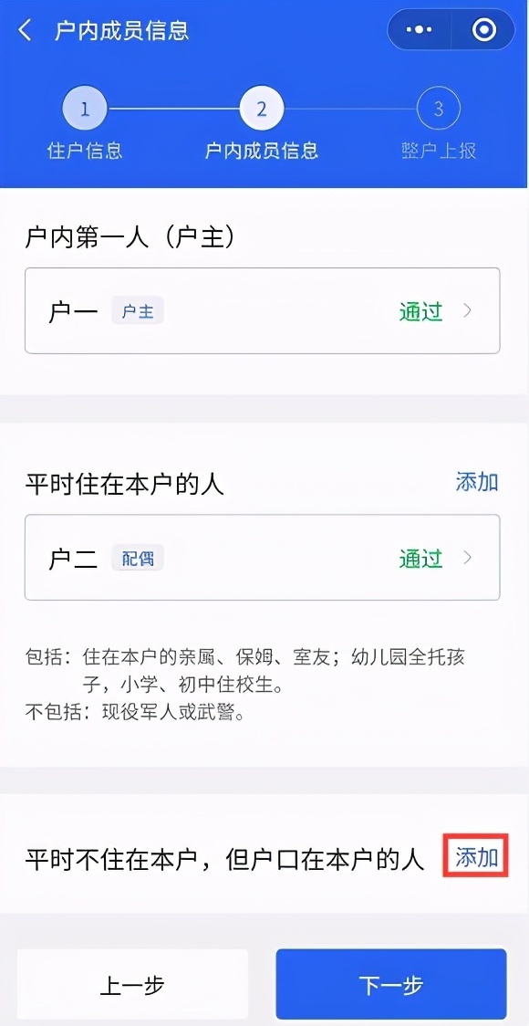 点击“平时住本户的人”后面的【添加】按钮,进行家庭成员信息填报,可添加多人,步骤见下图。