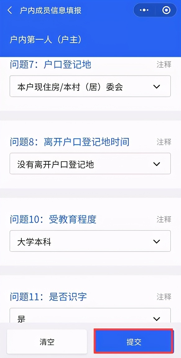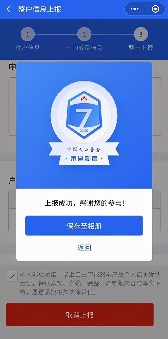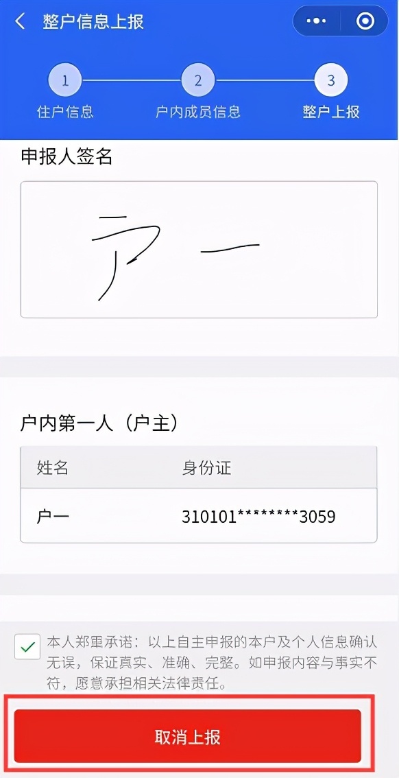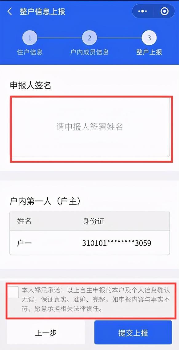 仔细检查填报信息,确认无误后于11月5日(截止日)前在“整户信息上报”界面按“提交上报”按钮上报。点击【下一步】→确认本户成员信息已全部填写完成→申报人签字确认→勾选“本人郑重承诺”→点击【提交上报】按钮。