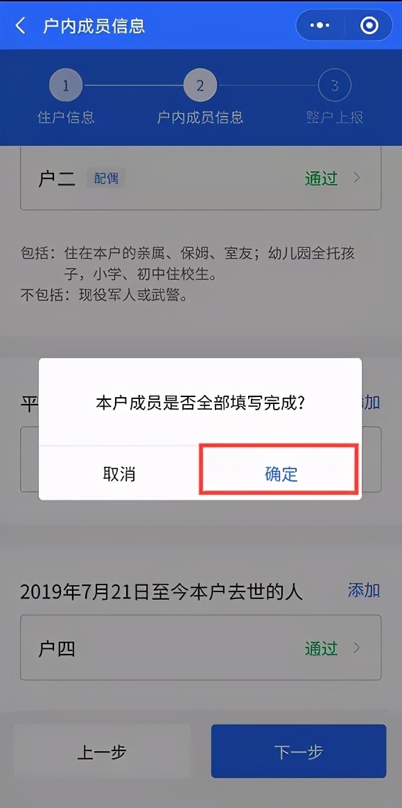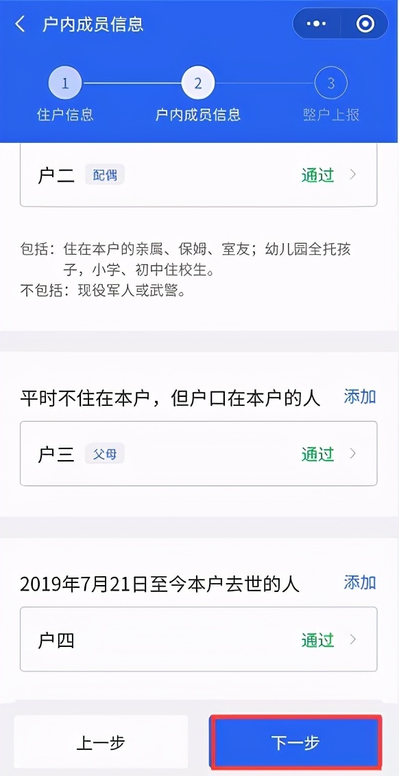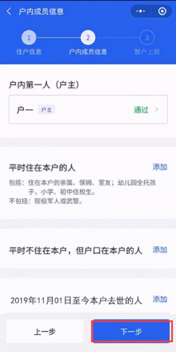 住户信息填完后点击住户信息页面下的【下一步】,进入“户内成员信息”界面,并进行数据录入操作,步骤见下图。