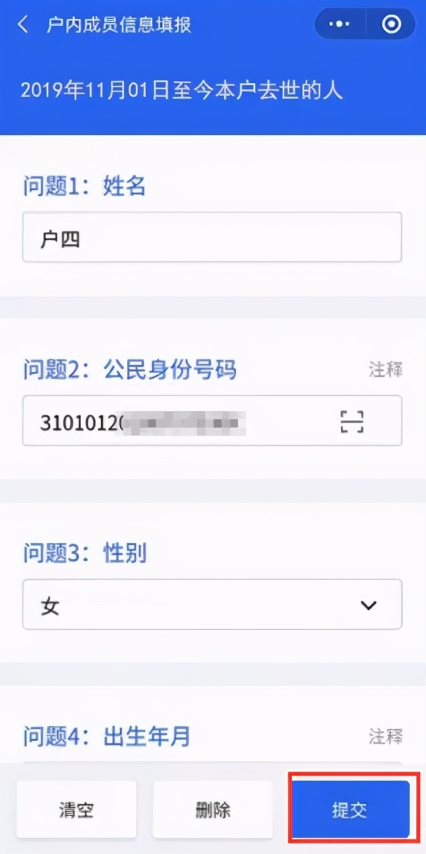 点击“2019年11月1日至2020年10月31日本户去世的人”后面的【添加】按钮,填报死亡人员信息,可添加多人,步骤见下图。