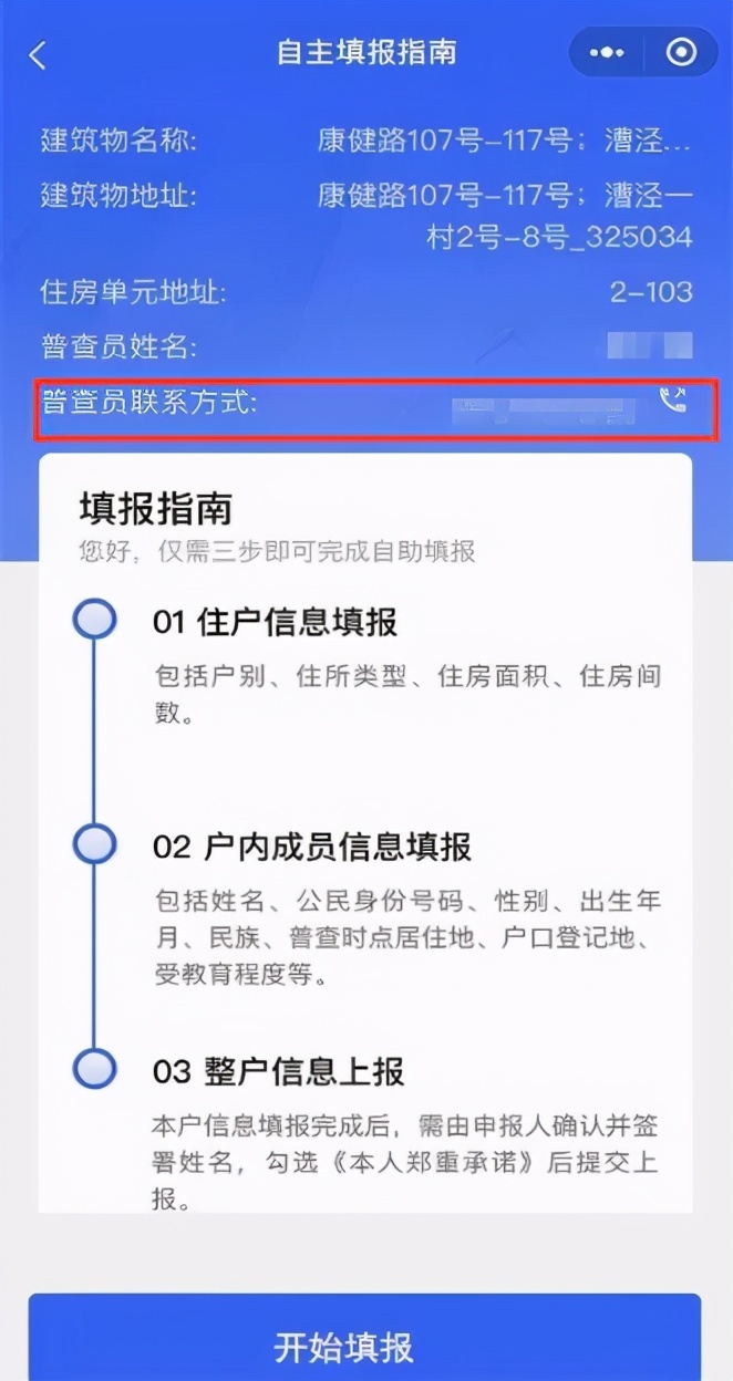 页面显示普查员的姓名和联系方式,可点击电话号码直接拨打电话,如遇到任何困难无法自主完成网络填报,请联系您的普查员或预约上门登记。