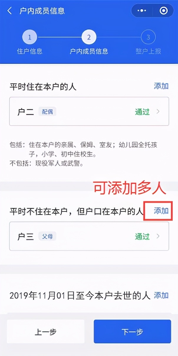 点击“平时不住在本户,但户口在本户的人”后面的【添加】按钮,进行“户在人不在”成员信息填报,可添加多人,步骤见下图。