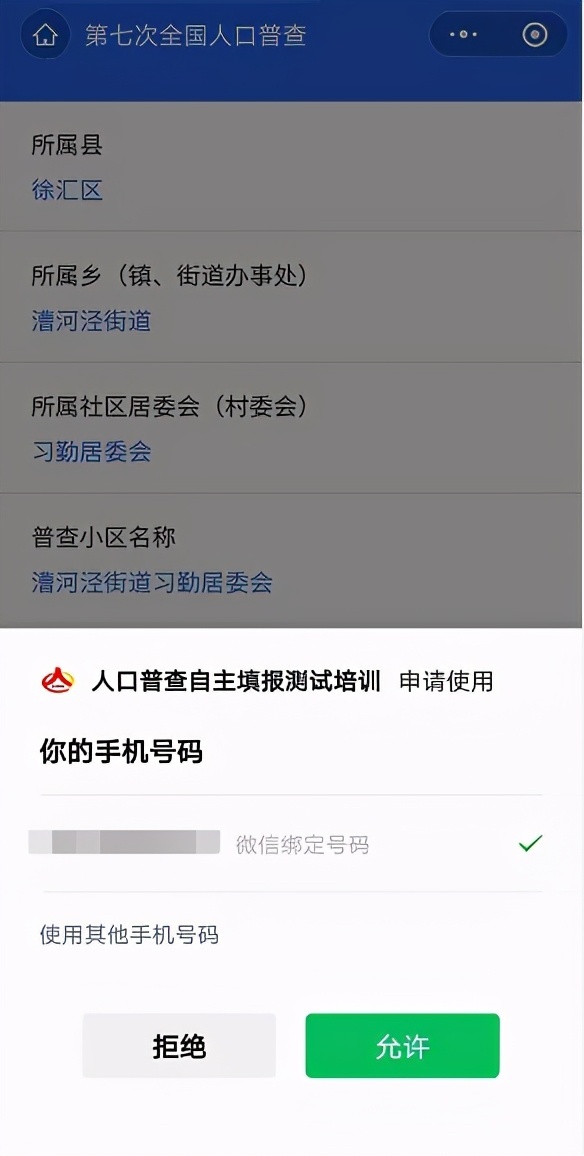 收到普查员提供的二维码后,打开微信扫描图中二维码或者长按二维码并识别二维码→进入中国人口普查页面→小程序会自动跳转到“请授权绑定您的手机号”界面,如下图所示。