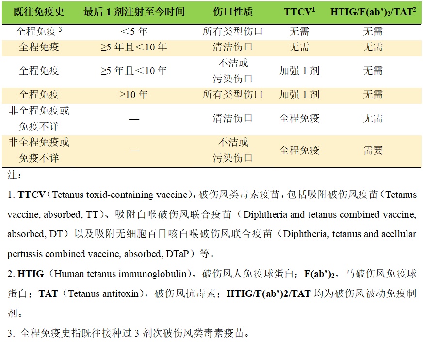 6岁以上儿童及成人接种破伤风疫苗,主要是根据外伤伤口性质和既往破伤风疫苗的免疫史决定,详见下表。