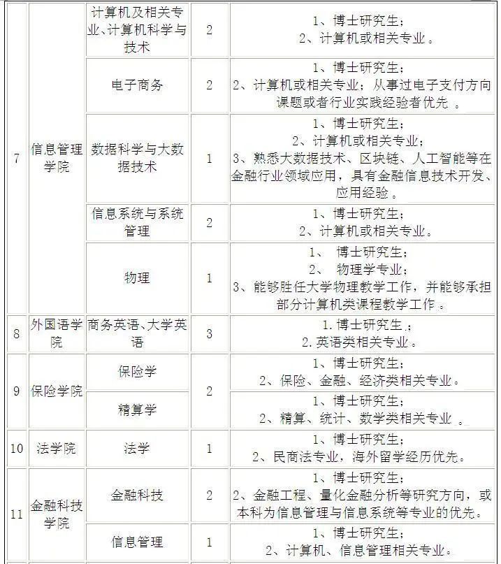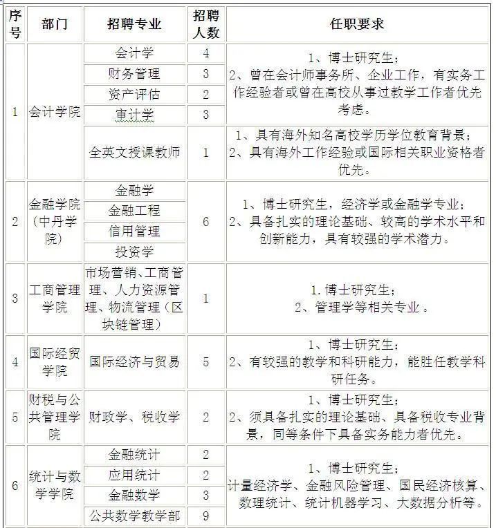 1.会计学院、金融学院、工商管理学院、国际经贸学院、统计与数学学院、信息管理学院、外国语学院、金融科技学院、法学院、保险学院、马克思主义学院等面向海内外招聘高层次人才,待遇优厚,薪资面议。应聘者可直接发邮件或来电咨询联系,专人接待。