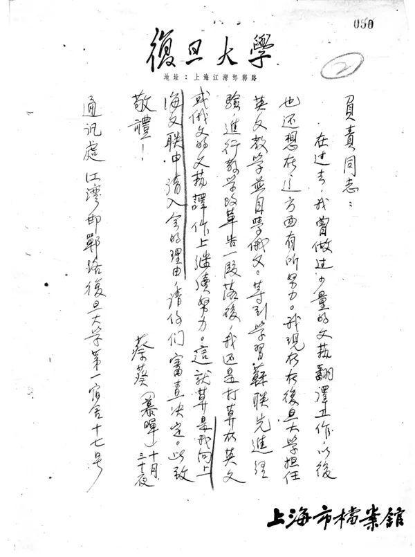 1953年,蔡慕晖写给上海市文联的信函(上海市档案馆藏)