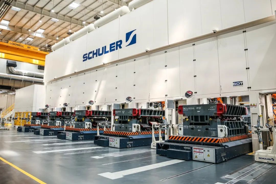 冲压车间建筑面积约31680㎡,主要生产单个车型的19个大型内外覆盖件。车间拥有两条世界先进的舒勒伺服高速压机线,并首次采用二层冲压件仓库,使用AGV与升降机对接实现零件在两层仓库之间的运输。两条压机线总吨位达6900t,最高冲次均可达18次/min,且该车间首次将重载型全向AGV应用到零件下线运输中,最大载重达1.5T,使用高级计划排程系统(APS),实现冲压生产计划自动排布。