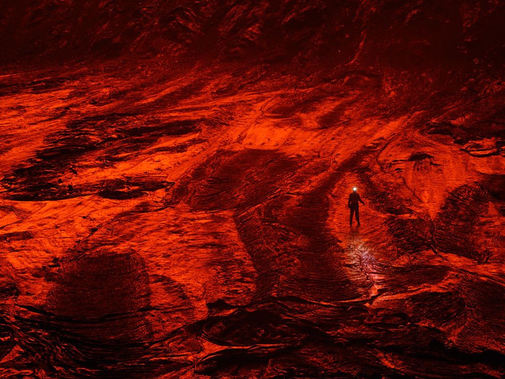 在直径超过200米的熔岩湖上,一名探索队成员正在火山口变凉的熔岩地面上行走,在熔岩湖发出的光线的映衬下,这片熔岩呈现出可怕的红色。