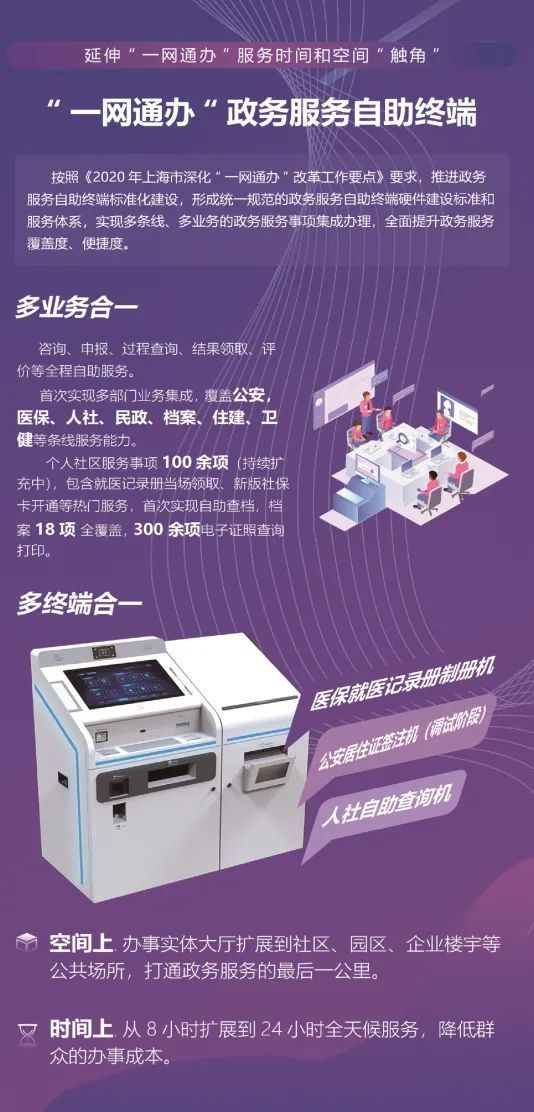 “一网通办”24小时自助服务区通过“刷身份证(或扫随申码)+人脸认证”进入,目前配备了一网通办自助服务个人事务终端、一网通办自助服务企业事务终端、自助电脑、社会保险查询机、医保自助服务机和自助证照柜等智能设备。