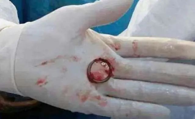 因为环已经嵌入了体内,取出来的时候血肉模糊,连环原本的材质都看不出了。