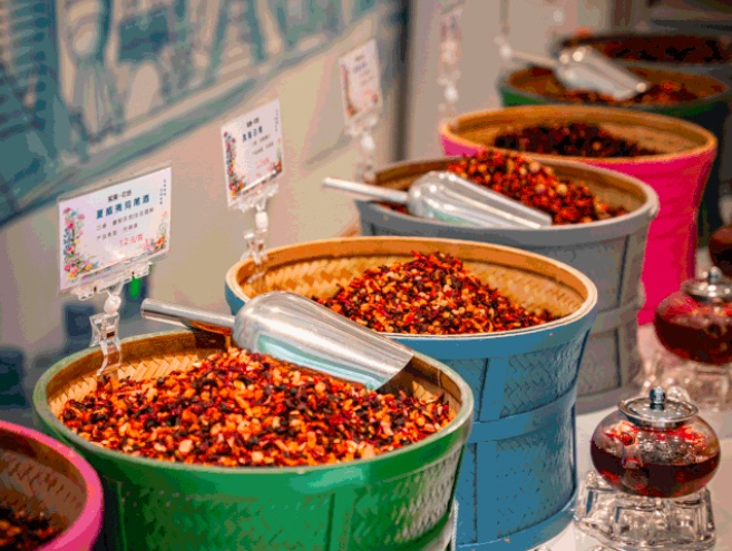 和邵万生、三阳同属于邵万生品牌旗下的黄隆泰,此次在步行街支路段开设了全新的品牌概念店——黄隆泰潮品花茶店。
